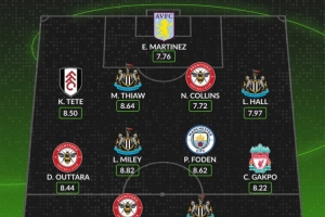 中场:丹戈·瓦塔拉(布伦特福德,8.44分)、刘易斯·麦利(纽卡斯尔联,8.82分)、菲尔·福登(曼城,8.62分)、科迪·加克波(利物浦,8.22分)