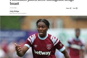 BBC:前西汉姆球员在社交媒体炫耀贩毒,被警方逮捕并判处3年监禁