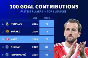 本世纪五大联赛最快参与100球排名:C罗居首,苏亚雷斯、凯恩前三