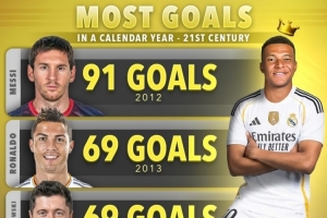 体育资讯12月15日讯 西甲第16轮比赛,姆巴佩破门,皇马客场2-1击败阿拉维斯。据Score90统计,姆巴佩2025年打进63球,排名本世纪自然年进球榜第四位。