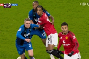 体育资讯12月16日讯 英超第16轮,曼联主场迎战伯恩茅斯,比赛第25分钟,曼联角球机会斯科特与卡塞米罗争顶疑似手球,裁判没有判罚。