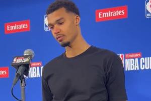 赛后发布会,文班接受采访,第一个问题他眼眶泛红全是泪水,用哭腔说着:“对不起,我今天失去了一位亲人。”