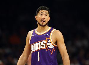 太阳主将布克上半场表现出色,进攻上相当稳健,面对勇士后卫单打成功率非常高,还能为队友送出助攻。