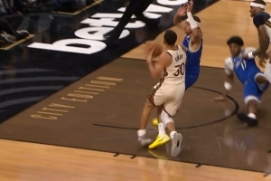 GIF-库里底角顶着人高难度后仰三分!